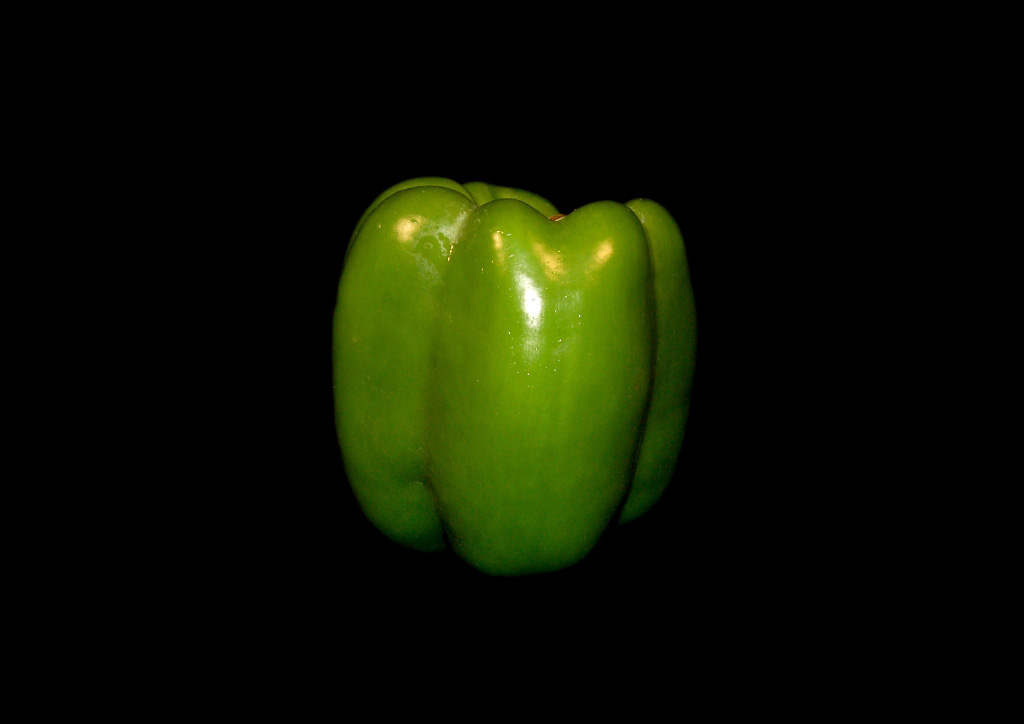 • The pepper is a deep dark green color, with a small white flash spot.,