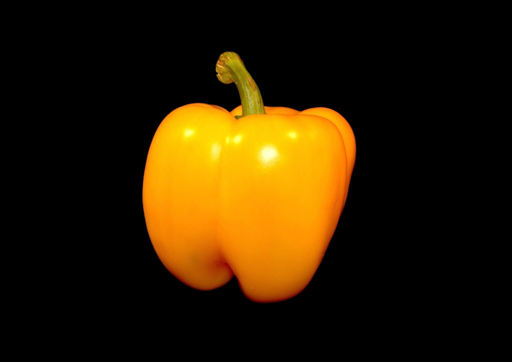 • The pepper is a bright yellow color, with a green stem at the top and a small white spot near the center where it reflected the camera flash.